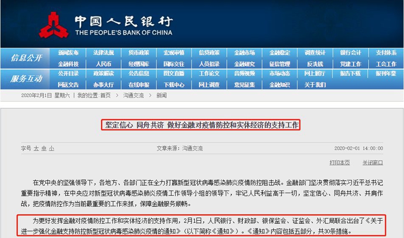 2月1日下午14:00,人民银行、财政部、银保监会、证监会、外汇局联合出台了《关于进一步强化金融支持防控新型冠状病毒感染肺炎疫情的通知》(以下简称《通知》)。《通知》内容包括五部分,共30条措施。《通知》提及,对受疫情影响严重的企业到期还款困难的,可予以展期或续贷。通过适当下调贷款利率、增加信用贷款和中长期贷款等方式,支持相关企业战胜疫情灾害影响。对因感染新型肺炎住院治疗或隔离人员、疫情防控需要隔离观察人员、参加疫情防控工作人员以及受疫情影响暂时失去收入来源的人群,金融机构要在信贷政策上予以适当倾斜,灵活调整住房按揭、信用卡等个人信贷还款安排,合理延后还款期限。此外,减免疫情严重地区公司上市等部分费用。