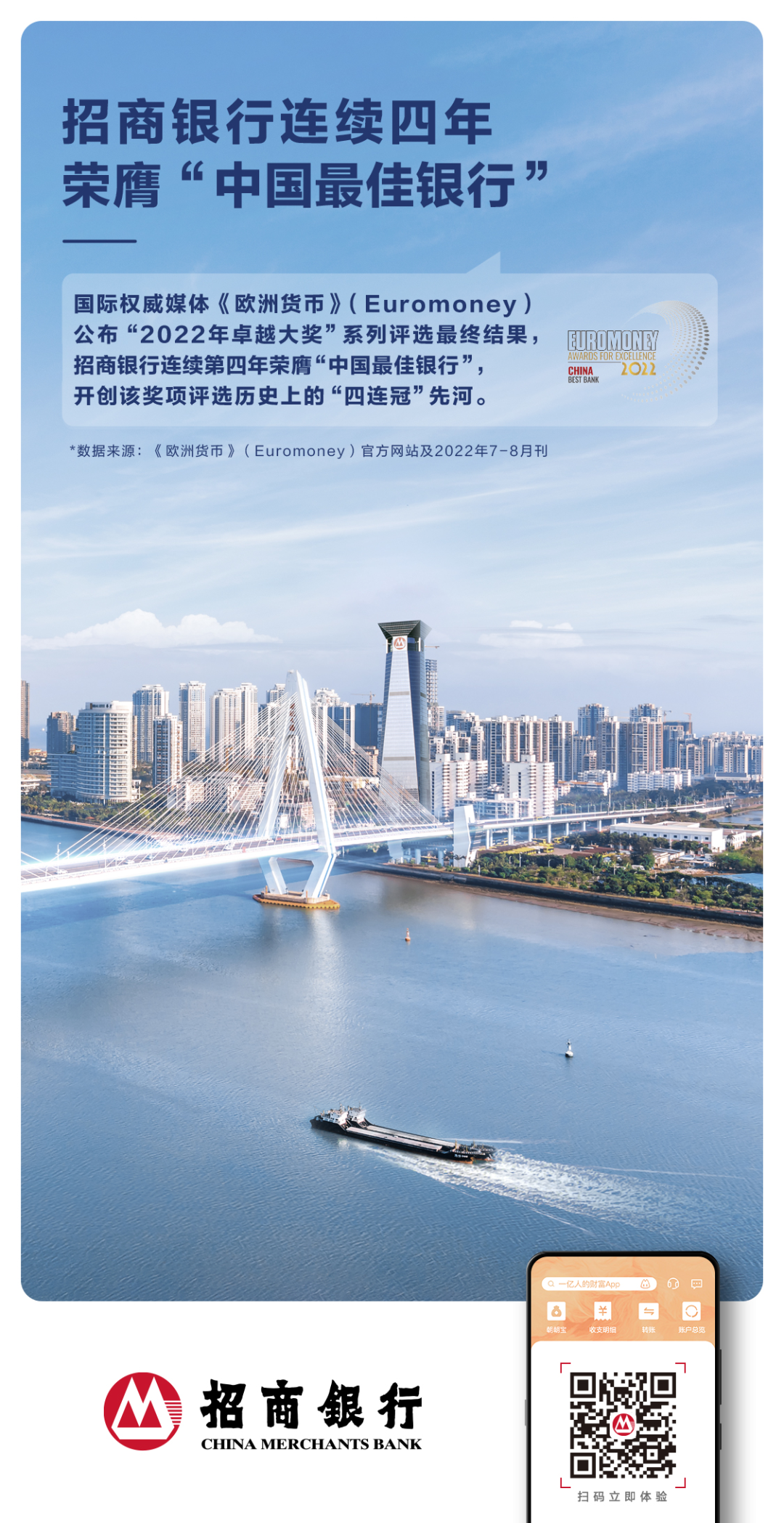 7月14日,国际权威媒体《欧洲货币》(Euromoney)在其官网揭晓“2022年卓越大奖”评选结果,招商银行继2019年、2020年和2021年后第四年荣膺“中国最佳银行”,创造该奖项在历史上的首次四连冠,也是唯一一家获得该奖项的中资银行。