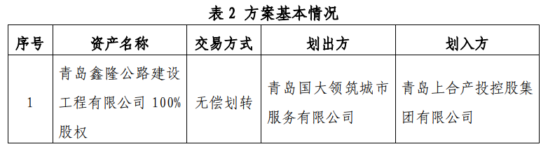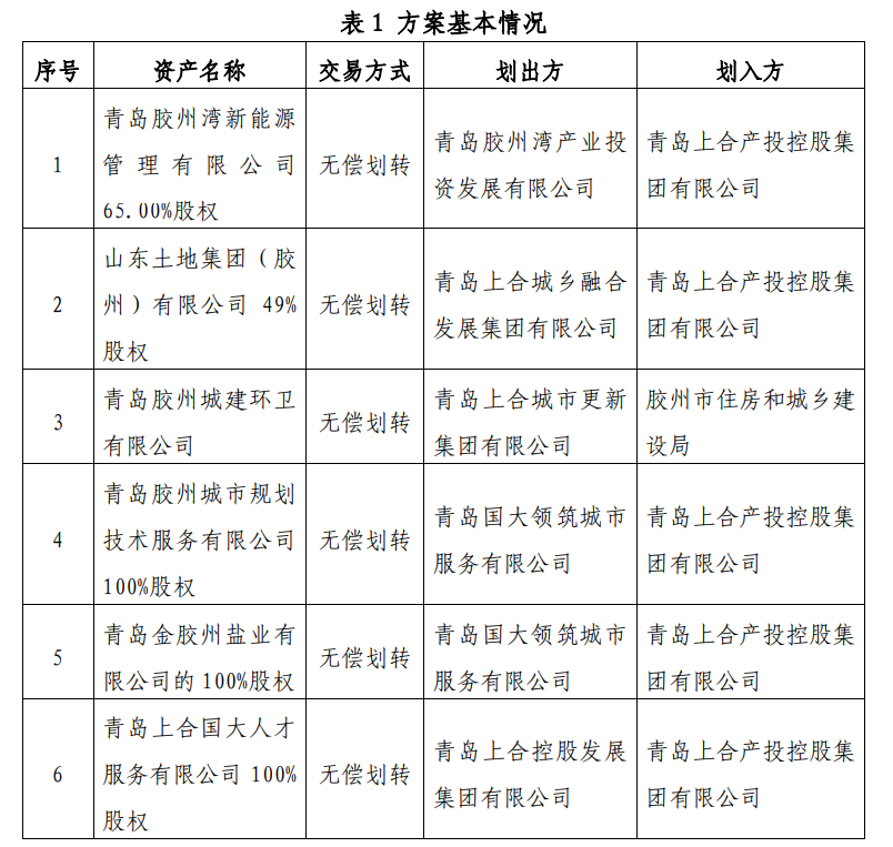 公告显示,根据《胶州市国有资产监督管理委员会关于青岛上合国大招商服务有限公司等股权及西王大厦等资产无偿划转的批复》、《青岛上合控股发展集团有限公司关于青岛胶州湾新能源管理有限公司和青岛能蜂电气有限公司股权无偿划转的批复》和青岛上合城市更新集团有限公司与胶州市住房和城乡建设局签订的《委托管理协议》,为进一步优化国有资本布局,强化公司发展战略,推动市属企业产业化转型发展,根据国企改革深化提升行动部署要求及国有资产管理有关规定,拟对胶州市国有资产进行整合。
