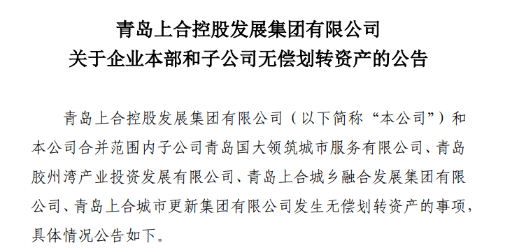 10月22日,青岛上合控股发展集团有限公司(以下简称“上合控股”)发布了一则《关于企业本部和子公司无偿划转资产的公告》,根据公告显示,上合控股和合并范围内子公司将无偿划转出7家公司股权资产。