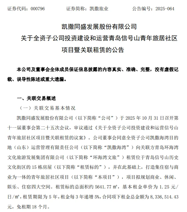 11月1日,凯撒同盛发展股份有限公司(以下简称:凯撒旅业,股票代码:000796.SZ)发布最新公告,公告称公司旗下全资子公司凯撒海湾目的地(山东)运营管理有限责任公司(下称“凯撒海湾”)拟以8336.51万元租赁关联方青岛环海湾文化旅游发展集团有限公司(下称“环海湾文旅”)位于青岛信号山历史文化街区的15栋房屋,打造集住宿与商业为一体的青年旅居社区项目。