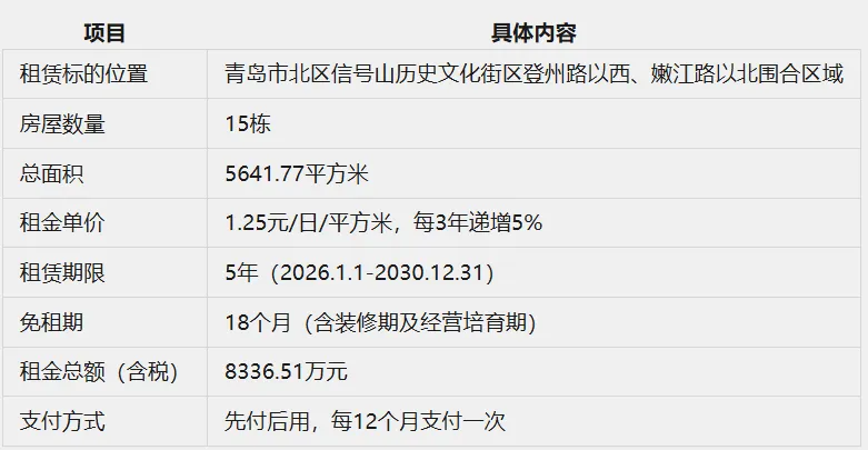 公告显示,本次租赁标的为青岛市北区信号山历史文化街区15栋独栋建筑,总建筑面积约5641.77平方米,始建于1938年,属于历史风貌保护建筑。租赁期限为5年,自2026年1月1日起至2030年12月31日止,基本租金单价为1.25元/日/平方米,每3年递增5%。合同约定扣除18个月免租期后,租金总额为8336.51万元(含税),免租期包含装修期及经营培育期。