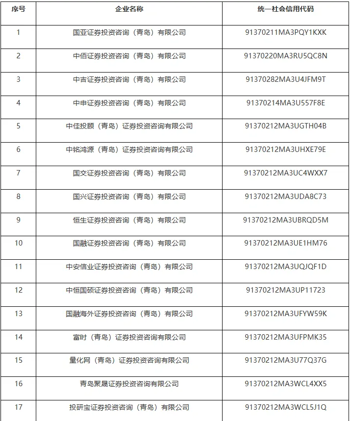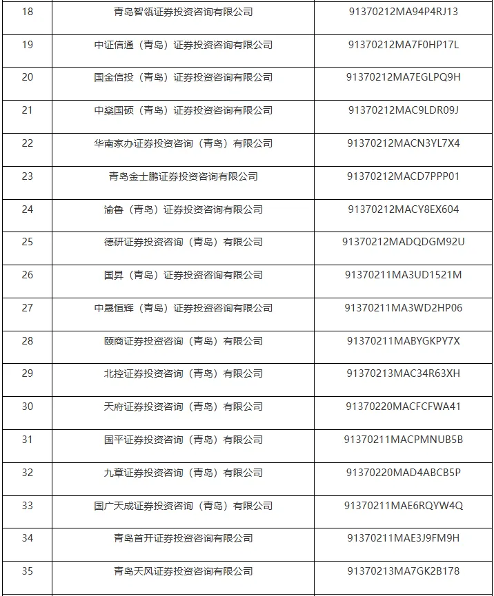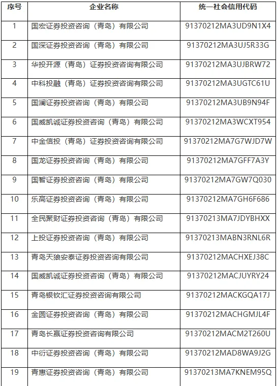 投资理财不受骗,查清资质是关键。据了解,这已经是今年青岛证监局发布的第二批“不具有合法证券期货经营业务资质的机构名单”了,今年8月6日,证监局曾公布过《青岛辖区不具有合法证券期货经营业务资质的机构名单(第一批)》,当时共有29家不具有合法证券期货经营业务资质的机构被公开,名单如下: