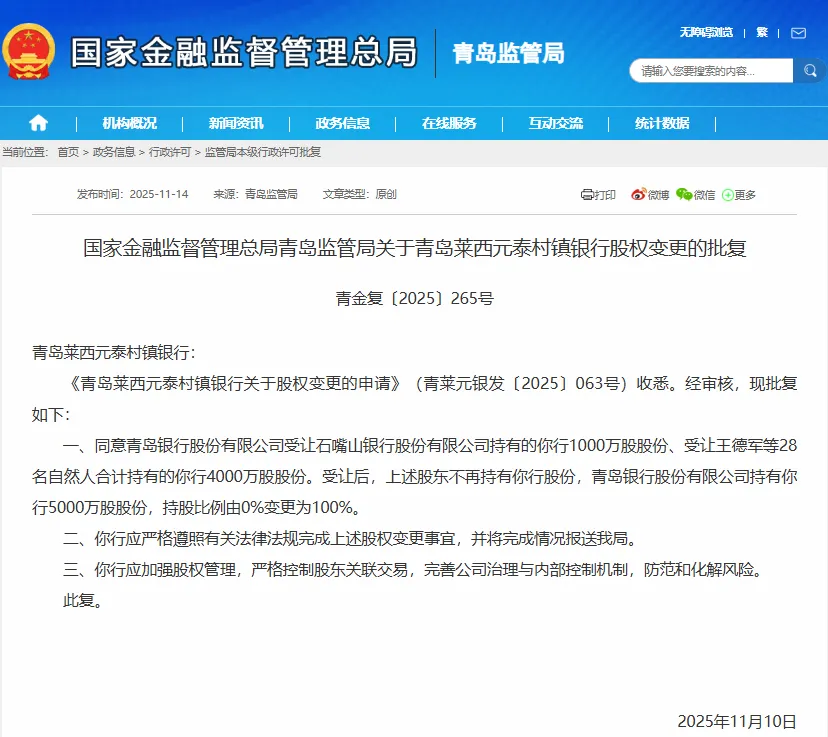 11月14日,国家金融监督管理总局青岛监管局官网最新发布了《关于青岛莱西元泰村镇银行股权变更的批复》,正式同意青岛银行股份有限公司受让石嘴山银行股份有限公司持有的莱西元泰村镇银行1000万股股份、受让王德军等28名自然人合计持有的4000万股股份。