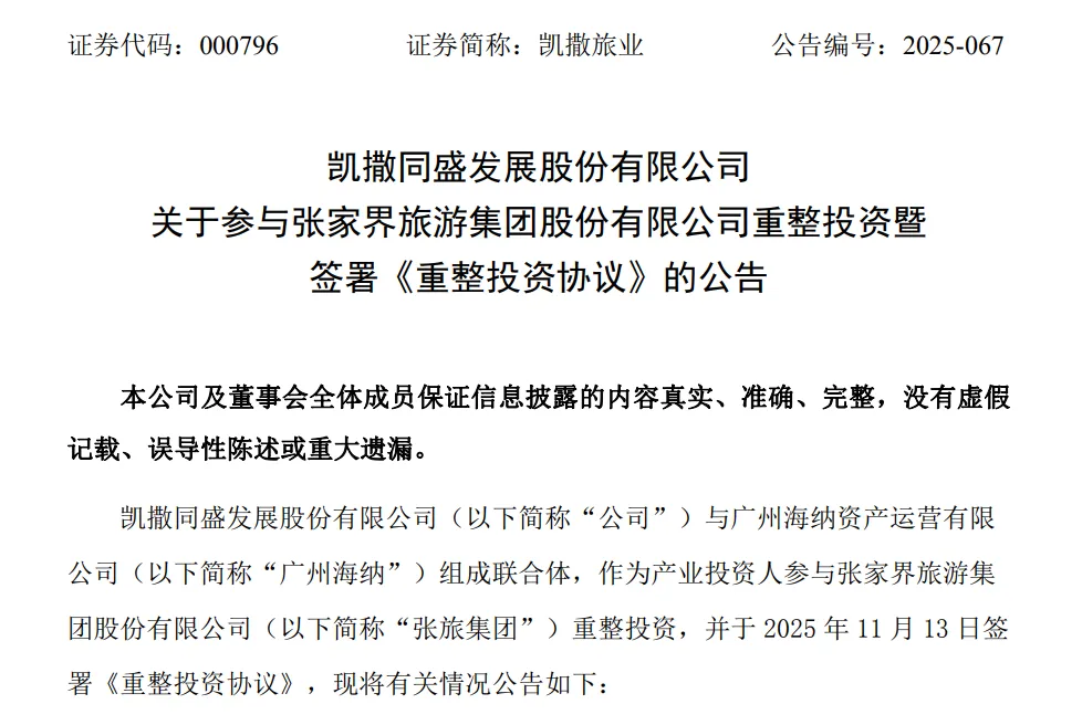 11月14日,凯撒同盛发展股份有限公司(以下简称:凯撒旅业 000796.SZ)发布公告宣布,公司与广州海纳资产运营有限公司(以下简称:广州海纳)组成联合体,作为产业投资人参与张家界旅游集团股份有限公司(以下简称:张旅集团 000430.SZ)重整投资。并已于2025年11月13日签署《重整投资协议》。