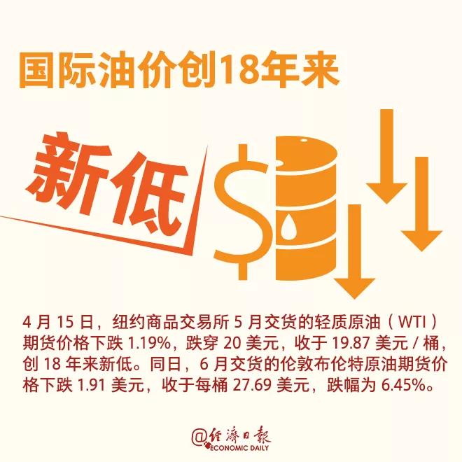 4月15日,纽约商品交易所5月交货的轻质原油(WTI)原油期货下跌1.19%,跌穿20美元,收于19.87美元/桶,创18年来新低。
