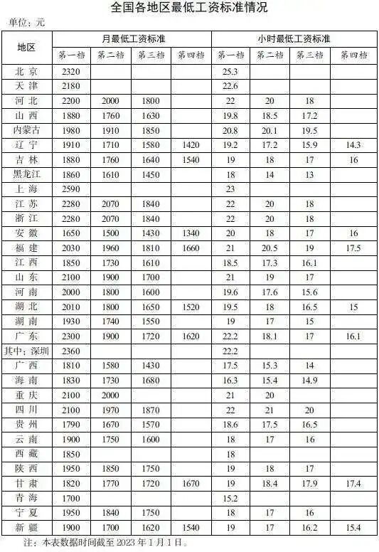 1月2日,人社部官网发布了全国各地区最低工资标准情况(截至2023年1月1日),从月最低工资标准来看,上海月最低工资标准达到2590元,全国居首。其次是深圳,月最低工资标准达到2360元,第三名是北京,月最低工资标准达到2320元。总体来看,14个地区月最低工资标准达到2000元及以上。