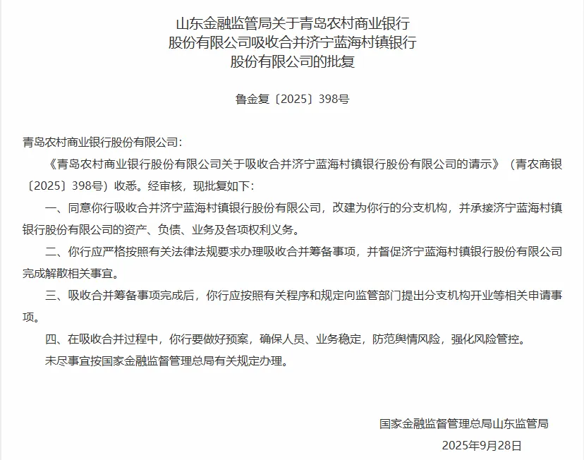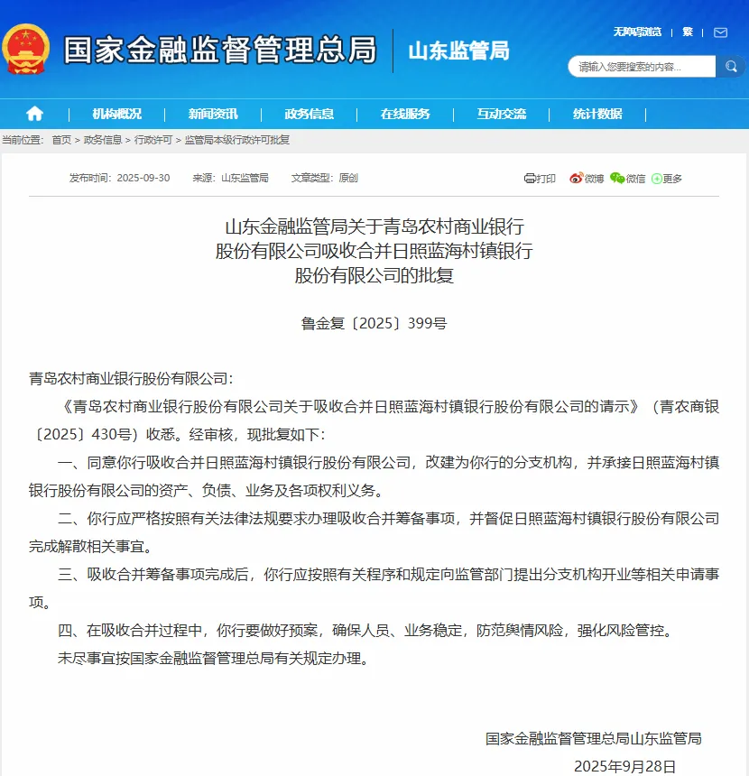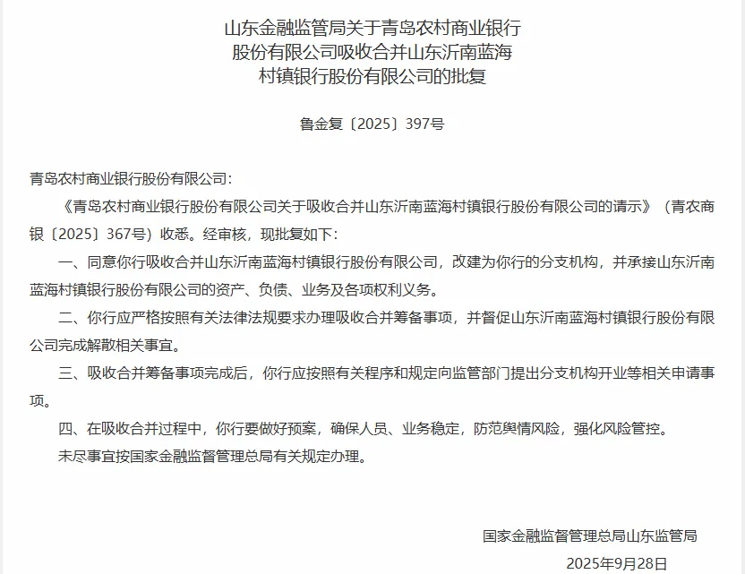9月30日,根据国家金融监督管理总局官网公布信息,日前山东金融监管局已正式发布关于青岛农商银行吸收合并三家村镇银行的官方批复,同意青岛农商银行吸收合并日照蓝海村镇银行股份有限公司、济宁蓝海村镇银行股份有限公司、山东沂南蓝海村镇银行股份有限公司,改建为青岛农商银行的分支机构。