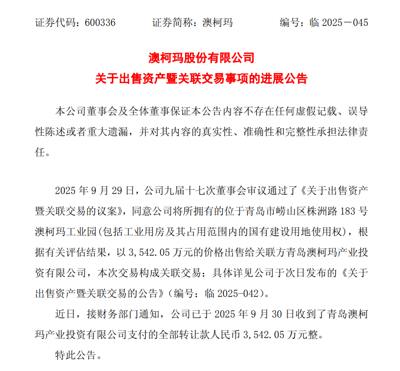 10月10日,澳柯玛股份有限公司(600336.SH)发布了一则《关于出售资产暨关联交易事项进展公告》。根据公告显示,9月29日公司九届十七次董事会通过议案,同意将位于青岛市崂山区株洲路183号澳柯玛工业园,以3542.05万元出售给关联方青岛澳柯玛产业投资有限公司,此交易构成关联交易。