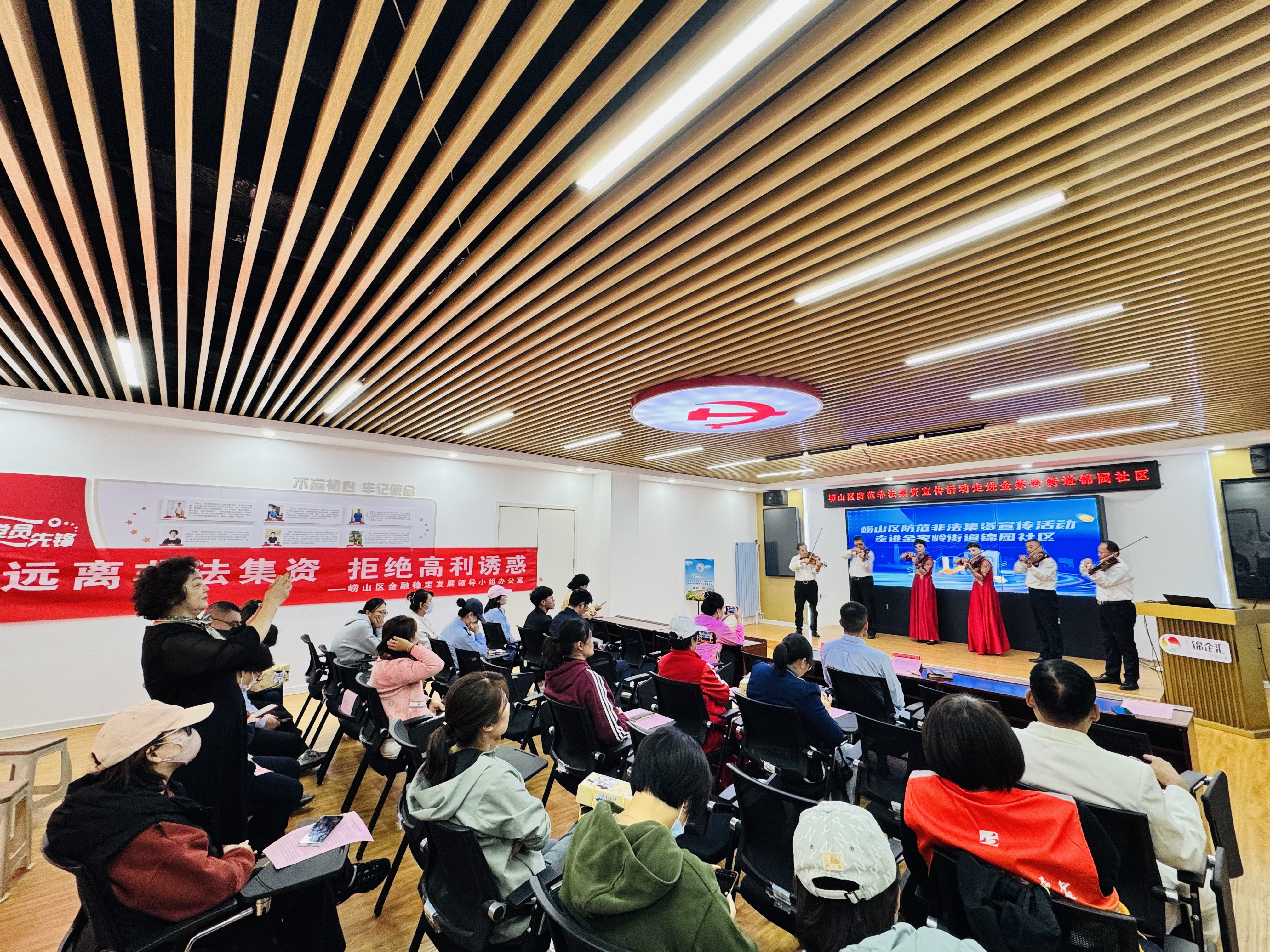 活动最后,为了让防非宣传更接地气、入人心,崂山区防非星火志愿者还精心策划了一场小型文艺演出,在本次活动上精彩上演。首先,日照银行青岛分行员工献上了改编歌曲《防非战线联盟》,他们将“高额回报是陷阱”等知识融入朗朗上口的旋律,既传递了防非理念,又展现了金融机构的活力;随后,社区居民们踊跃登台,独唱的《夕阳红》、萨克斯演奏《想你的时候问月亮》《我和我的祖国》,都赢得了热烈的掌声;最后,小提琴弦乐组合演奏《我爱你中国》,激昂的旋律点燃了现场居民朋友的爱国情怀,大家纷纷跟着节奏轻声哼唱,将活动推向了高潮。