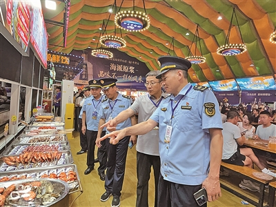 市场监管人员在啤酒节期间开展食品安全执法检查。