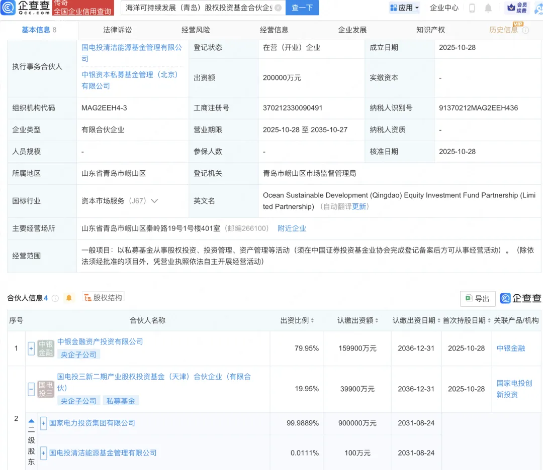 根据企查查APP显示,近日,海洋可持续发展(青岛)股权投资基金合伙企业(有限合伙)在青岛市崂山区注册成立,注册资金20亿元,经营范围包含:以私募基金从事股权投资、投资管理、资产管理等活动。执行事务合伙人为国电投清洁能源基金管理有限公司、中银资本私募基金管理(北京)有限公司。