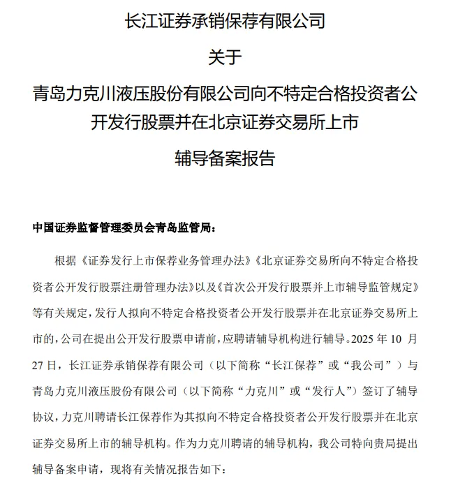 10月29日,新三板创新层企业青岛力克川液压股份有限公司(以下简称:力克川)发布了关于申请公开发行股票并在北交所上市辅导备案公告。公告表示,公司在青岛证监局启动IPO辅导备案。拟冲刺北交所,保荐机构为长江证券承销保荐。