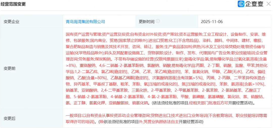 关于企业经营范围的调整,根据企查查最新信息显示,变更前海湾集团的经营范围为:国有资产运营与管理;资产运营及投资;自有资金对外投资;资产策划;资本运营服务;工业工程设计、设备制作、安装、维修、包装服务;国内商业、贸易(国家禁止的除外);进出口贸易等;而在完成变更后,海湾集团的经营范围则明显收窄,变更为:以自有资金从事投资活动;企业管理咨询;货物进出口;技术进出口;业务培训等。业内专家认为,此次变更标志着这家老牌国企在深化混改与战略转型道路上正式迈出了关键一步。