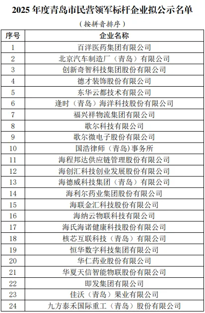 216家企业上榜!青岛公示2025年度民营领军标杆企业名单
