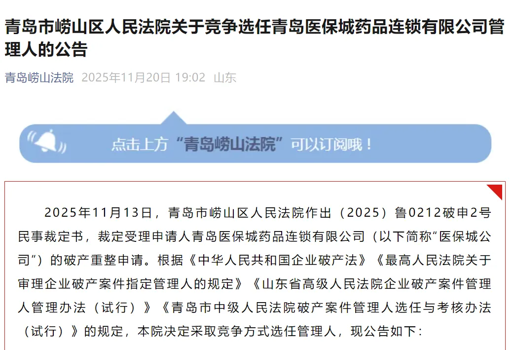 近日,青岛市崂山区人民法院官微发布了一则《关于竞争选任青岛医保城药品连锁有限公司管理人的公告》,根据公告显示,青岛市崂山区人民法院已经正式作出民事裁定书,裁定受理青岛医保城药品连锁有限公司(以下简称:青岛医保城)的破产重整申请,并将以竞争方式公开选任管理人。