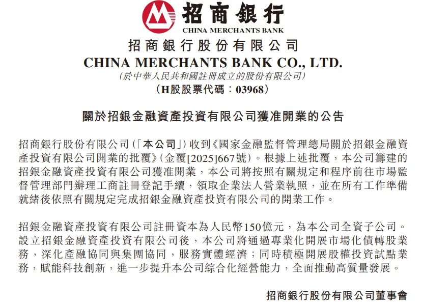 其实就在一天之前的11月21日晚间,招商银行也发布过一则公告,宣布已收到金融监管总局正式批复,其筹建的招银金融资产投资有限公司(以下简称:招银金融投资”)获准开业。