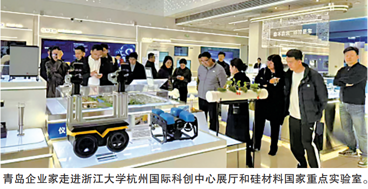 在浙江大学,青岛企业家们走进浙江大学杭州国际科创中心展厅和硅材料国家重点实验室,现场体验浙江大学在信息技术、生命科学、集成电路、半导体材料的最新研究方向和转化成果,并进行了现场对接交流,青岛企业家纷纷表示:“这种面对面交流带来的启发,是看一百份报告都无法比拟的。”
