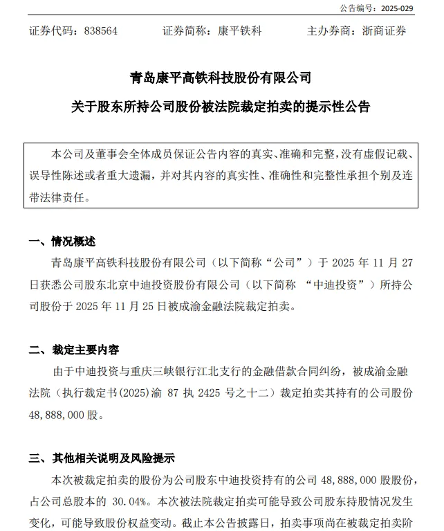 11月27日,青岛康平高铁科技股份有限公司(证券简称:康平铁科,证券代码:838564)发布最新公告,表示公司于11月27日获悉股东北京中迪投资股份有限公司(以下简称:中迪投资)所持有的本公司股份于2025年11月25日被成渝金融法院裁定拍卖。