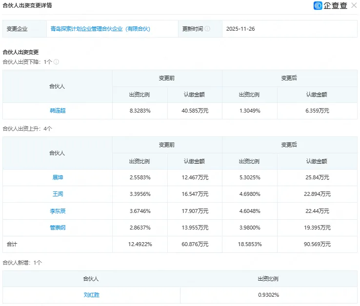 据了解,青岛探索成立于2019年8月,目前在斯坦德的持股占比为17.06%,位居第三位。而此前韩连超在青岛探索的出资比例是8.3283%,本次下降至1.3049%,合伙企业在总出资额未发生变化的情况下,韩连超减少的这部分出资额被转让给了展坤、王闻、李东辰、管崇钢、刘红胜,其中刘红胜为新增合伙人。此次出资额变动,也导致韩连超间接减持斯坦德检测股份。
