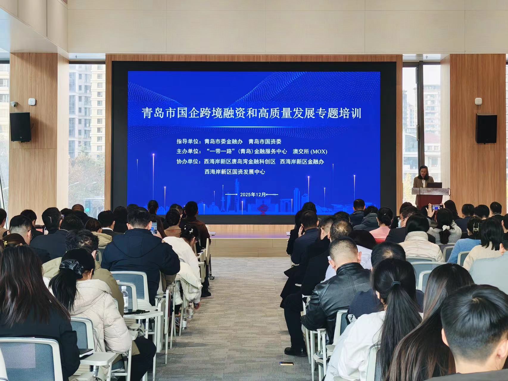 为全面贯彻中央、省、市关于深化国企改革和产业转型的工作部署,持续推进青澳两地跨境合作,充分发挥“一带一路”(青岛)金融服务中心作用,拓展青岛国有企业融资渠道,提升“走出去”的能力,2025年12月4日,青岛市地方国企跨境融资及高质量发展专题培训成功举办。本次培训由青岛市委金融办、市国资委联合指导,“一带一路”(青岛)金融服务中心、中华澳门金融资产交易股份有限公司(以下简称“MOX澳交所”)主办,西海岸新区唐岛湾金融科创区、西海岸新区金融办、西海岸新区国资发展中心协办,来自市、区(市)两级近70家国企的高级管理人员、财务管理人员、投融资负责人以及财政、金融、国资部门相关负责人员参会,总人数近150人。