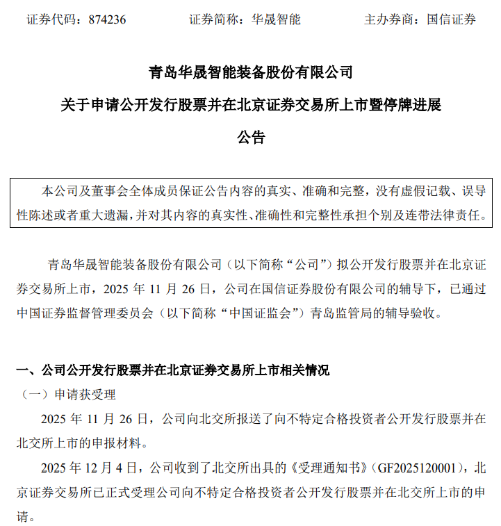 12月4日晚间,北交所官网发布信息显示,青岛华晟智能装备股份有限公司(以下简称:华晟智能)IPO已获受理。
