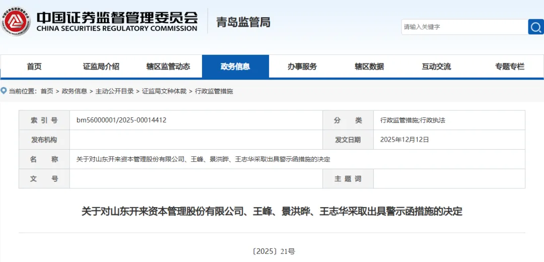 近期,青岛证监局针对青岛葳尔量化投资管理有限公司、青岛颐道通达投资管理有限公司、山东开来资本管理股份有限公司3家公司及相关主要负责人出具了3份警示函。