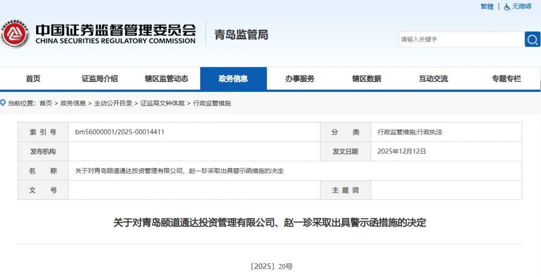 根据青岛证监局〔2025〕20号警示函显示,经查,青岛颐道通达投资管理有限公司从事私募基金业务活动未遵循诚信原则,违反了《私募投资基金监督管理条例》(国务院令第762号,以下简称“《私募条例》”)第三条第二款的规定;赵一珍作为公司法定代表人、总经理,未能恪尽职守、勤勉尽责,对上述行为负有主要责任,违反了《私募条例》第三条第四款的规定。