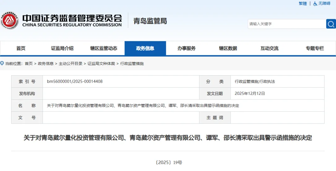 根据青岛证监局〔2025〕19号警示函显示,经查,青岛葳尔量化投资管理有限公司(以下简称:葳尔量化)在开展私募基金业务过程中,将基金投资管理职责委托他人行使。上述行为违反了《私募投资基金监督管理条例》(国务院令第762号,以下简称《私募条例》)第二十七条第一款的规定。