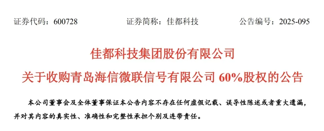 12月16日,佳都科技集团股份有限公司(以下简称:佳都科技,600728.SH)对外披露重大股权收购公告。根据公告显示,佳都科技全资子公司广东华之源信息工程有限公司(以下简称:华之源)将以现金7920万元,收购青岛海信微联信号有限公司(以下简称:海信微联)60%的股权。