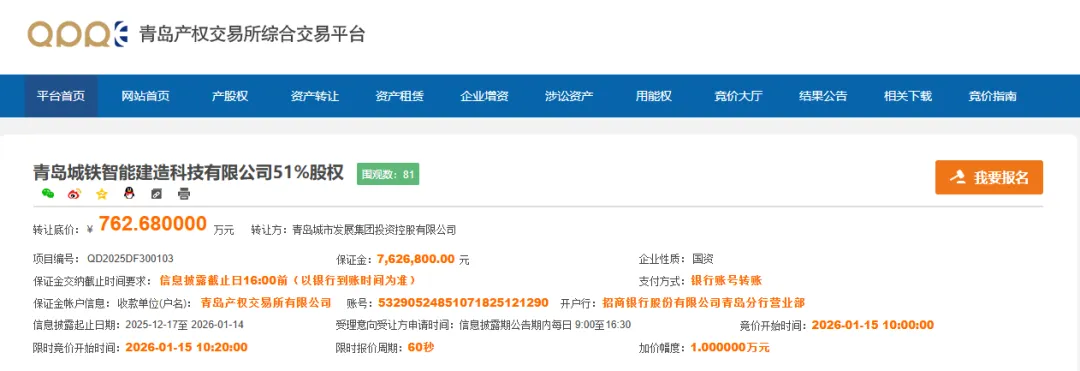 12月17日,青岛城铁智能建造科技有限公司51%股权转让项目在青岛产权交易所正式挂牌,转让底价762.68万元,转让方为青岛城市发展集团投资控股有限公司,信息披露起止日期:2025年12月17日至 2026年1月14日。