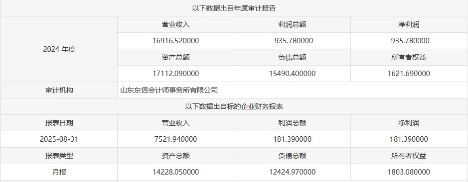 根据该公司2025年8月份发布的财务报表显示,公司2024年营业收入16916.52万元,利润总额为-935.78万元,净利润为-935.78万元,资产总额为17112.09万元,负债总额为15490.40万元,所有者权益为1621.69万元。今年1-8月营业收入为7521.94万元,利润总额为181.39万元,净利润为181.39万元,资产总额为14228.05万元,负债总额为12424.97万元,所有者权益为1803.08万元。