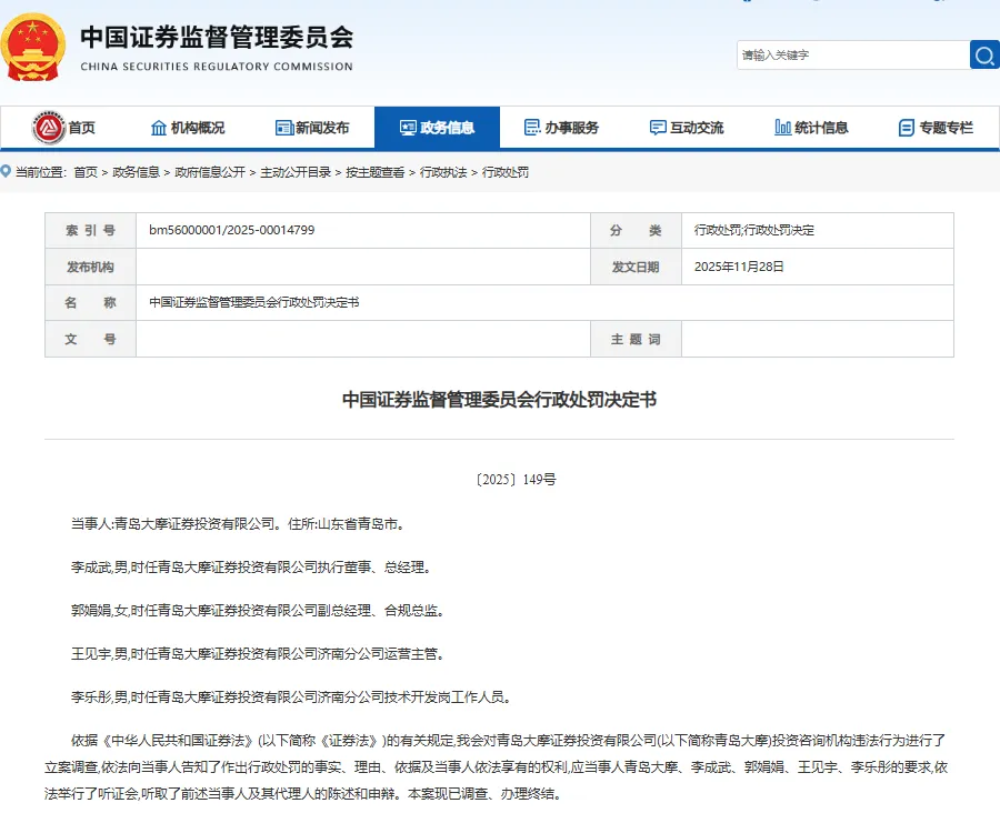 12月19日,证监会官网公布的行政处罚决定书,显示对青岛大摩证券投资有限公司(以下简称:大摩投资)处以300万元罚款,并处撤销证券投资咨询业务许可。同时,对该公司4名相关责任人给予警告,并分别处以60万元、50万元、40万元、30万元的罚款。