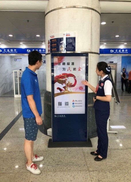 在各支行营业厅,电子海报机在滚动播放“金融标准为民利企”海报,服务人员通过海报、手机向客户介绍关于金融标准的知识,宣传银行营业网点服务基本要求和服务评价准则。收到了广大客户的高度关注。9月份交通银行青岛分行正式启动营业网点“两标”认证工作,借助这次“金融标准为民利企”宣传活动,将大大推进我行的工作。