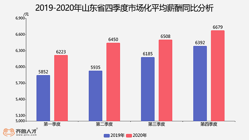从上图走势来看,疫情给山东带来的冲击通过一季度市场化平均薪酬直观反映出来,一季度山东省市场化平均薪酬全年最低,为6223元;二季度薪酬为6450元,上涨明显;三四季度薪酬分别为6508元和6679元依旧持上涨态势。就薪酬涨幅来看,2020年二季度创季度最高涨幅,薪酬同比2019年同期上涨515元。