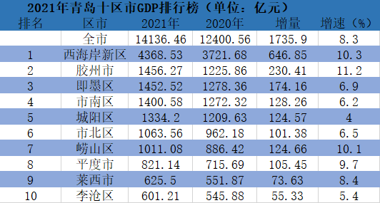 2月14日,青岛市统计局公布2021年分区市主要经济数据。从GDP总量来看,黄岛区(西海岸新区)、胶州、即墨、市南、城阳排名前五,市北、崂山首次突破千亿元。从GDP增速来看,胶州、黄岛、崂山增长均超10%,平度、莱西市也跑赢全市大盘。